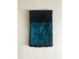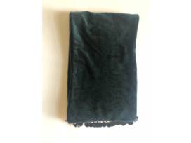 This scarf is a lovely shade of patterned velvet teal on one eside with black confetti dots on the other. Black circle tassels adorn the end.