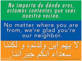 Make others feel welcome with 1 sign that reads "we're glad you're our neighbor," plus a stand
