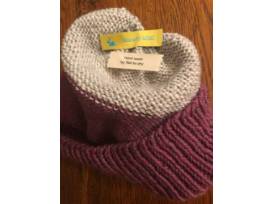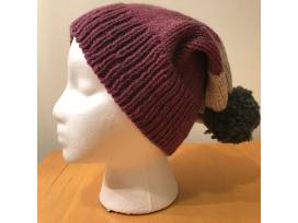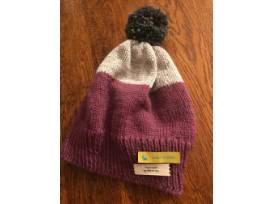 Adult-sized hat (M-L) made with premium 100% wool with beautiful raspberry and cream colorblock, with a charcoal grey pom-pom top. Handmade by Powell grandmother "Mimi". Non-scratchy wool. Warm. Handwash.