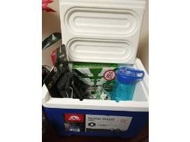 The lucky bidder of this cute little cooler will receive - Srixon Marathon Flightspeed 16pk Golf Balls, a bag of tees, golf towel, club brush, water bottle and a Large Men's Wilson golf glove.