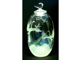 ROBERT LEE FRITZ has worked with glass since 1971. When he established his studio in Lombard, he was the first Chicagoland independent hot glass artist. He specializes in creating hand-blown crystal paperweights, vases, and sculptures on which he carves silhouettes of cranes (the symbol of long life and good fortune), herons, and other Midwestern birds.