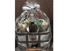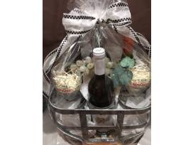 Wine Rack, 2 Wine glasses and Four (4) Bottles of Wine: River Road Chardonnay, Pindar Winter White, Barefoot Cabernet Sauvignon, Wolffer Estate Cabernet Sauvignon.