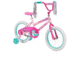 Girls' Huffy 16" Sea Star has a durable steel frame decorated with great graphics and fun colors. Easy to use coaster brake; single-speed bike. Sparkly streamers make her ride more fun.