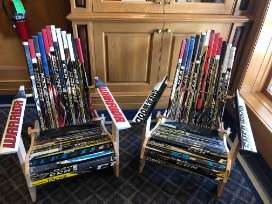 Own this one-of-a-kind set of folding adirondack chairs made from Columbus Blue Jackets game used hockey sticks! Generously made by Jason Zumpano and Garry Kimber.