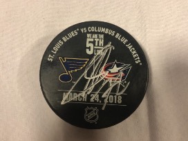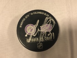 One (1) Hockey Fights Cancer Official Warm Up Puck used during pregame warm ups on October 27, 2018 and signed by CBJ Captain #71 Nick Foligno