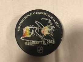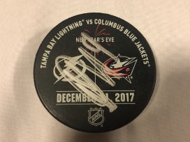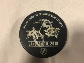 One (1) Military Appreciation Official Warm Up Puck used during pregame warm ups on January 18, 2018 and signed by #13 Cam Atkinson