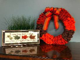 Included is a burlap wreath donated by Burlap Blooms. Colors include red, orange and brown.