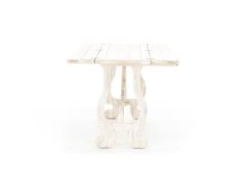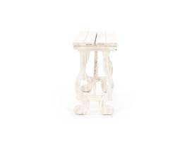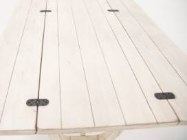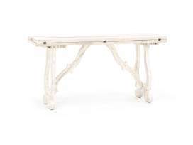 The highest bidder takes home this fold-out console table. The gentle soft curve of the legs and cross bars add a lively and playful look to this charming console table. Finished in White Orchard rub, the plank style top is hinged on either side, and can be opened when you need a larger surface, for serving guests, or closed and placed under a mirror for a splendid display for your pottery collection and a pair of towering candlesticks.