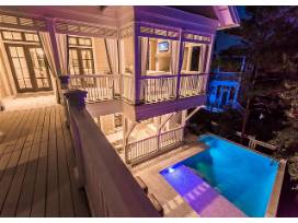 This spacious 5 bedroom, 4.5 bath home, in the Camp District in WaterColor, will not disappoint! When entering the home on the first floor, you will encounter a living area followed by a master queen bedroom with a connecting bathroom that has a double vanity, jetted tub and glass shower. This bedroom also connects to the patio. The next bedroom has a full size bed and a connecting bathroom that has a single vanity and a tub and shower combination. The last bedroom on this floor has a queen bed and a connecting bathroom with a single vanity and a tub and shower combination. All of these bedrooms come with a flat screen television and all the comforts you would expect! Beginning on the second floor, you will be welcomed by the bright great room with its warm tones, comfortable furnishings, high ceilings and gorgeous hardwood floors. You will also be able to enjoy meals from the home's spectacular kitchen! There, you will experience the high end appliances, granite counter tops, stunning cabinetry and large kitchen island. This kitchen has all of the items needed to prepare that delicious meal! The impressive living room, well-appointed dining room and fantastic kitchen are all included in this open floor plan for everyone to enjoy after a fun-filled day at the beach. What a perfect end to a perfect day! Next, you will find a master king bedroom located on this floor with flat screen television and a connecting bathroom that has a double vanity and a glass shower. There is also balcony access from this bedroom. Continuing on this floor is the man cave with a wet bar, keg beer tap and a projection screen television and DVD! On the third floor is the fifth bedroom that has a bunk bed (two twins) for all of the kids to enjoy! Let's not forget the viewing tower on the fourth floor and the private pool with all of the outdoor space for you to enjoy! This house has ample indoor and outdoor space, which makes for a truly great gathering spot for everyone to spend time together, making a memorable vacation!