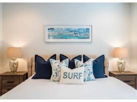 The first floor presents a beautiful master suite, offering a plush king bed and private en-suite bathroom with a glass-front shower and single vanity. Also on the first level is a secondary living room area, with a plush sofa and a large mounted flat-screen television.