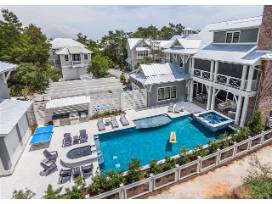 This is a brand new 5,571 sq. foot vacation haven ideally situated in WaterColor's Lake District just moments from the Western Lake bridge. This spectacular retreat boasts the largest private pool in WaterColor, an indoor fireplace, shuffleboard, a foosball table, pinball machine, arcade game, ping pong and quick access to Western Lake. Large families and groups will feel right at home at "Vermillionaire" which has six bedrooms, six bathrooms, a carriage house and impeccable accommodations for up to 21 guests. When you aren't hanging poolside or playing a game of shuffleboard, explore the area on the bikes provided or head over to neighboring Seaside for some amazing shopping and dining venues.