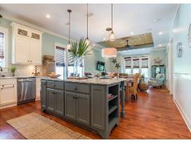 Seafoam and sand-color exteriors with pops of off-white trim offer an instant coastal welcome. Inside the entryway, guests are greeted with an open-concept main floor, which combines the living, dining, and kitchen areas.