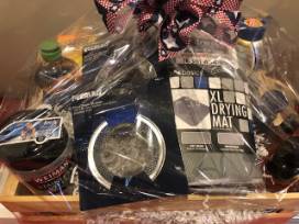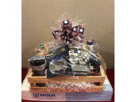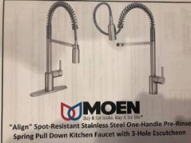 This basket from JAY'S PLUMBING consists of a Moen Align #5923RS Spot-resistant Stainless Steel One-Handle Pre-Rinse Spring Down Kitchen Faucet, Moen #141002SRS Spot-resistant Stainless Steel 3-Hole Escutcheon, Seventh Generation Dish Soap, Bar Keepers Friend Soft Cleaner, Weiman Stanless Steel Wipes, Scrub Daddy Sponge, Peerless Mesh Dish Strainers, Grey Kitchen Towel, Teal Kitchen Towel, 4-Pack of Grey, Teal, and White Bar Mop Towels, Grey XL-Drying Mat.