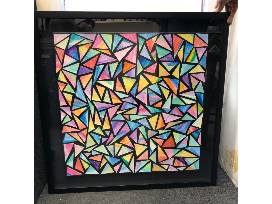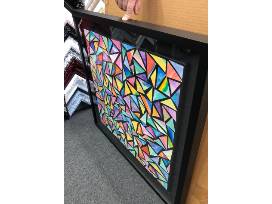 After every student created their own unique and vibrant watercolor artwork in class, they were all cut up and combined to create this spectacular kaleidoscope of color! Watercolor paper on canvas, custom framed 2" black wood shadowbox.