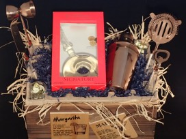 This tequila caddy is for the discerning tequila lover! Package Includes: award winning Signature Tequila Esperanto Reposado 250ml (aged 1 year) - made exclusively in El Llano distillery, Jalisco, Mexico,Tahari 5 piece stainless steel bar set (cocktail shaker, bottle opener, double jigger, cheese knife, cocktail strainer), set 4 Lucid Wood cocktail coasters, $10 gift certificate Thompson Liquors, two premium shot glasses, aged wooden crate.