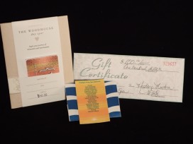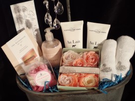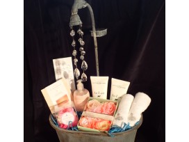 Take the day off! Relax and unwind with this $50 gift certificate to the beautiful Woodhouse Day Spa to use towards products or services, then treat yourself to a relaxing spa treatment with this $100 gift certificate to Young Living Spa! Package also includes: "Whats Up Buttercup" bath bomb cupcake with exfoliant top, Au Lait Exfoliating Bath Scrub and Body Butter, vanilla rose scented soap petals, peony shea butter lotion, 2 embroidered face cloths, large metal bathtub caddy with solar powered sparkle water effect (function not tested).