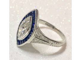 You cannot take your eyes off this beautiful Platinum Art Deco style ring featuring a One-Carat Bezel Set Marquis Shaped Diamond surrounded by 22 French-Cut Tapered Baguette Blue Sapphires. The Hand Engraved Shank has 8 Round Brilliant Cut Diamonds.