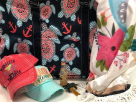 2. Extra Large Beach Tote - Navy w/ Turtles, Anchors, Chevron and Key Print filled with beach hats, Bacardi Rum, and other beach themed items.