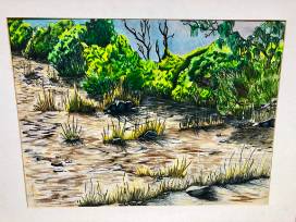 Acrylic landscape matted painting by Luis Heurta measuring 23.5" x 28.5".
