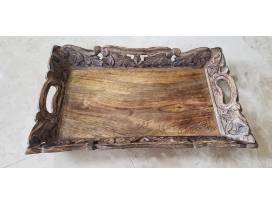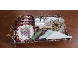 Here is a beautiful wooden tray, 1 Platter, 4 appetizer plates, 4 hand made napkins, 1 Candle and 1 Cheese Spreader