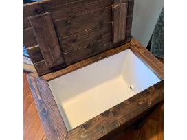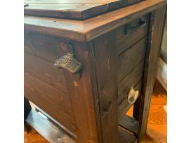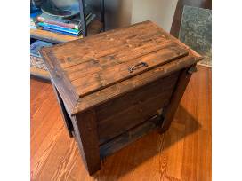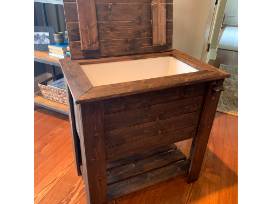 Spice up any deck or patio with this beautifully stained wooden cooler stand from 7th grade. The cooler is perfect with an open top lid, bottle opener, and bottom shelf.