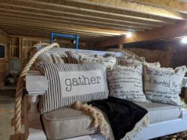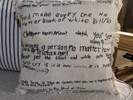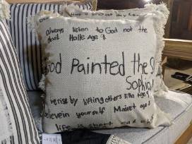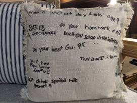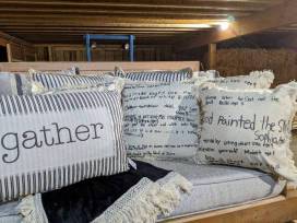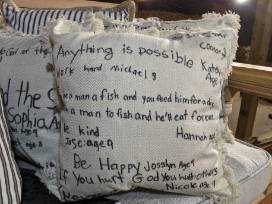 3rd graders teamed up to create this gorgeous porch swing! The pillows are "Life Lessons by 3rd Graders." Sit back and relax enjoying the summer sunshine and cool fall breezes.