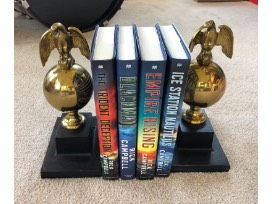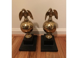 Also included is a set of vintage eagle bookends. These bookends are vintage Federal period Ball and Eagle brass flagpole toppers from the 19th century. They have been repurposed into a charming rare pair of brass & iron bookends. Donate by MOSC DC.