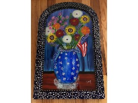 This one of a kind folk art piece was created by Sissy Cutchen of Sissy's Folk Art specifically for the 2019 Step Up to the Plate Gala. It is forward and reverse painted glass in an antique American frame.