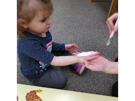 Toddler handprints were used to create the variety of safari animals. Toddlers that moved to primary in January were also part of this project.