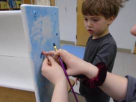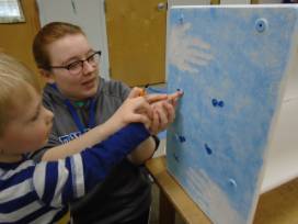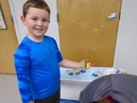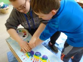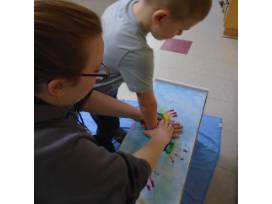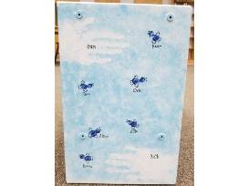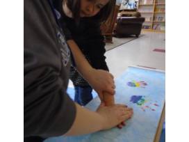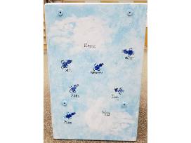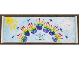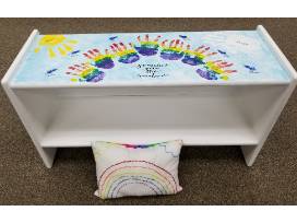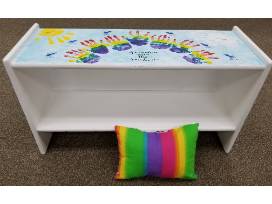 The rainbow is made out of the hand prints of the Kindergarten children. The other class members have used their fingerprints to make the bluebirds that fly above the rainbow and clouds. In addition to the bench, the Kindergarten children have also hand sewn a beautiful rainbow pillow to sit on top and we have included some themed books for the shelf on the bottom. Staff make the handprint clouds and sun.