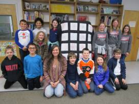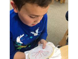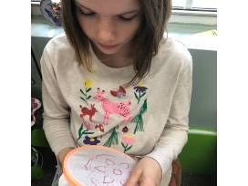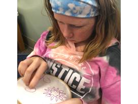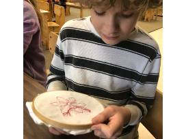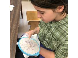 The children have done much work with mandalas this year creating providing the inspiration of this hand-embroidered class quilt. One student also suggested that the corners be different, so we did that as well. They selected their own designs and colors, and accomplished the work with only a little (okay, maybe quite a bit more than a little) assistance from Marie with knot untangling.