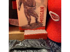 Reds 150 Year Oakley Backpack with a hat, Joe Morgan mini statue, Joey Votto bobblehead, Scott Schebler bobblehead, and koozies