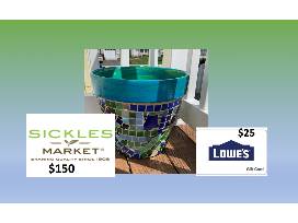 $150 Sickles Market Gift Card, $25 Lowes Gift Card PLUS Gorgeous Mosaic Flower Pot made by Stacey Abate (12 inches in diameter) PLUS: Bulbs, Garden Gloves, and Miracle Gro Shake 'n Feed
