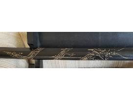 This wooden bokken is a display piece. Bokkens, AKA katanas, are practice swords for use in Japanese martial arts. This one has a dragon engraved on it..