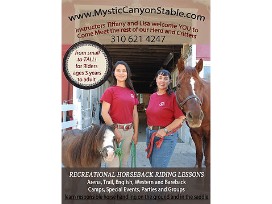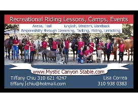 Join instructor Tiffany Chiu and Lisa Correa at Mystic Canyon Stable in PV to learn all about horsemanship, horse safety and care as well as riding (English, Western, Bareback pad)! Start by grooming and tacking up your horse, then RIDE in our arena and/or on the trails. From ponies to horses, we'll find the right mount for you and your loved ones to ride!