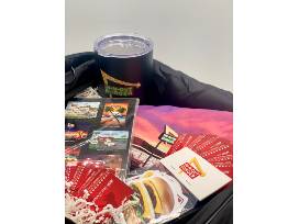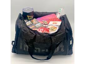 An In-N-Out lightweight, durable duffel bag filled with 12 Value Meal Cards (each good for a burger, fries and beverage) and In-N-Out swag, such as a large long-sleeve t-shirt, 30oz stainless steel tumbler with lid (for hot or cold beverages), and so much more!