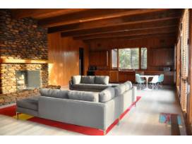 The pool house has a queen bed in the master bedroom, and two twins in the second bedroom. There are two bathrooms: one with a large tub and shower, the other with a shower. A large river stone fireplace anchors the house, which is steps away from an in-ground swimming pool designed to look like a deep, dark glacial lake surrounded by large boulders on all sides.
