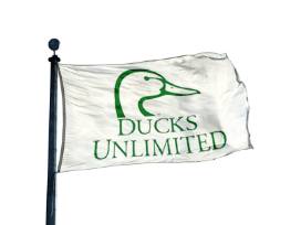 This item is a Ducks Unlimited Flag featuring the Duck Head Logo. The color is green and white. Fabric is nylon