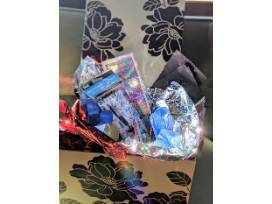 Basket including some French Festival prizes including notepad set, french pencils, bonbon (French candy), 4 Orangina drinks and 4 FAB coupons for next year's French Festival
