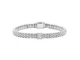 Pavé set diamonds in a sterling silver x station on a Caviar beaded bracelet. Finished with a signature box clasp detailing the LAGOS crest. LAGOS diamonds are the highest quality natural stones.