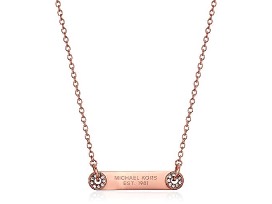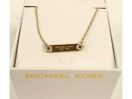 Pave crystal grommets give a rebellious sparkle to the logo-engraved ID plaque pendant on this gold-tone Michael Kors necklace. It is perfect for layering or wearing alone. Show your chic style and support Providence by bidding on this item now! Retail price $95