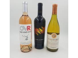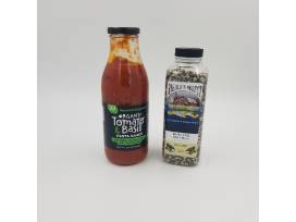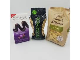 - Basket with three bottles of wine, Amish egg noodles, organic tomato basil sauce and Riehle's Select popcorn