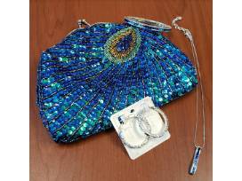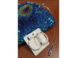 Accessory set includes a beautiful sequined peacock clutch and 3-piece set of jewelry from Brighton, including Spectrum necklace, Spectrum hinged bangle, and hoop earrings in blue.