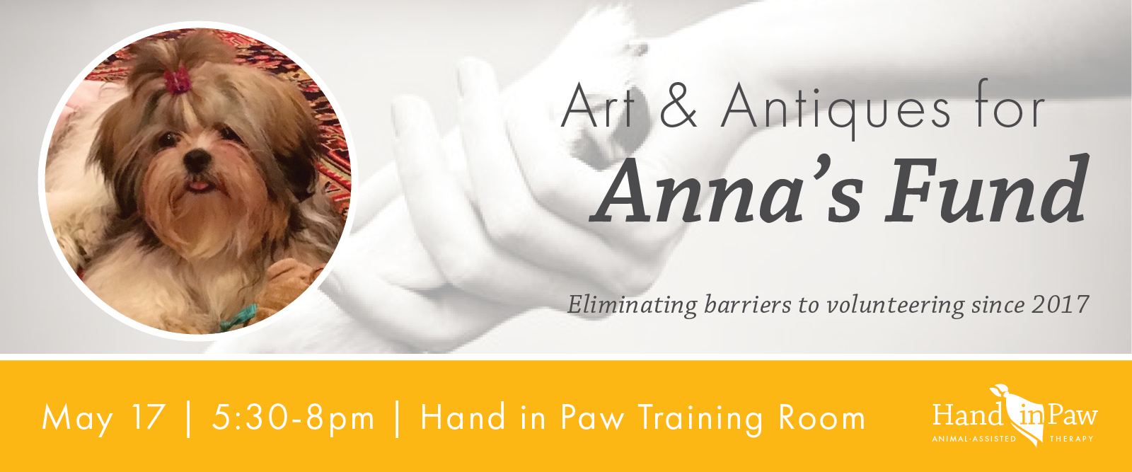 You're invited to Art & Antiques for Anna's Fund, a silent auction on May 17th at Hand in Paw's Training Room.