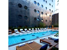 - Guests can enjoy access to the hotel's 5,000 sq ft pool deck with 800 sq ft of imported sand, Cote D'Azur-inspired chaise lounges, two private cabanas, DJ booth and a glass-bottom swimming pool looking into the hotel lobby.