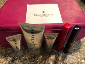 Pink makeup bag with travel size Elizabeth Arden beauty products.