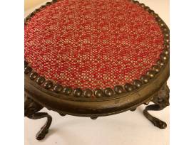 Vintage Victorian Foot Stool with red and white tapestry nail head top. Intricate metal detail and design. Wood top with metal base. A stunning piece of history.