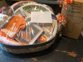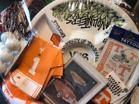 Package of 50 Oval Paper Dinner Plates, Hand Painted Vols Porcelain Serving Dish, 1 package of TN Jersey napkins, TN Ping Pong Balls, TN Dasher Head, Vols Hooded Poncho, Knox Vegas Note Cards, Tennessee Temporary Tattoos, Power T Vinyl decal, Power T Button/Pin, VOLS License Plate, Tennessee Bandana, Vols Paper Placemats, 3 1/2 Foot Indoor/Outdoor Inflatable Power T with Anchors