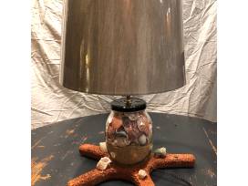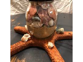 This working handmade lamp is a piece of paradise. Base is a painted wooden starfish with a glass jar of real sand and seashells. Includes a new, grey lampshade (11x13x9). Plug it in and sit back and relax!