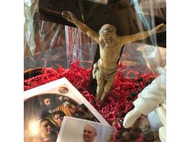 Generations Sculpture by Timothy Schmalz, 2 crucifixes (Blessed by Pope Francis 2015), Large Crucifix Wall Hanging, 2 Wooden rosaries, Program from 2015 Papal Mass- Philadelphia, & a Pope Francis Prayer Card